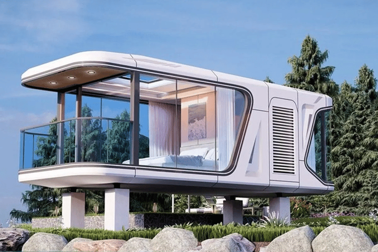 As the name suggests, a space capsule mobile home is a living space that combines space technology and the concept of a mobile home.